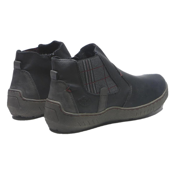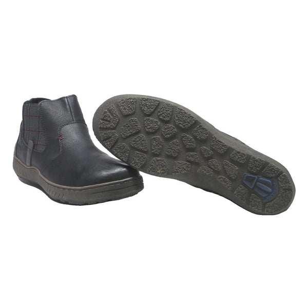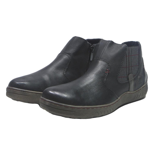 These COMFINO womens boots feature a sleek black leather upper with a stylish check-patterned elastic side panel in shades of grey and red accents. The boots have a slip-on Chelsea style with a low ankle height, perfect for everyday wear and easy use.