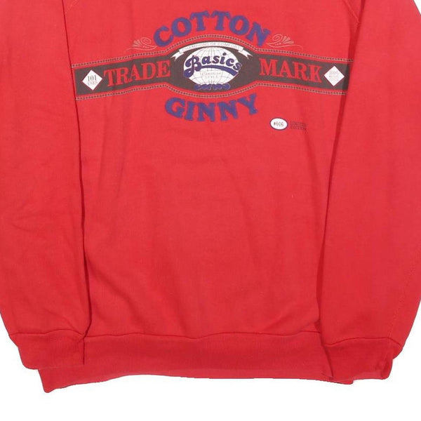 This Womens sweatshirt from Cotton Ginny features a vibrant red colour with a central graphic print in blue and black, displaying the words "Cotton Ginny", "Trade Mark", and "Basics" for a casual vintage look. The front design highlights branding elements that enhance the garment's distinctive appeal.