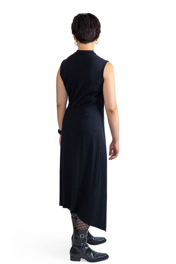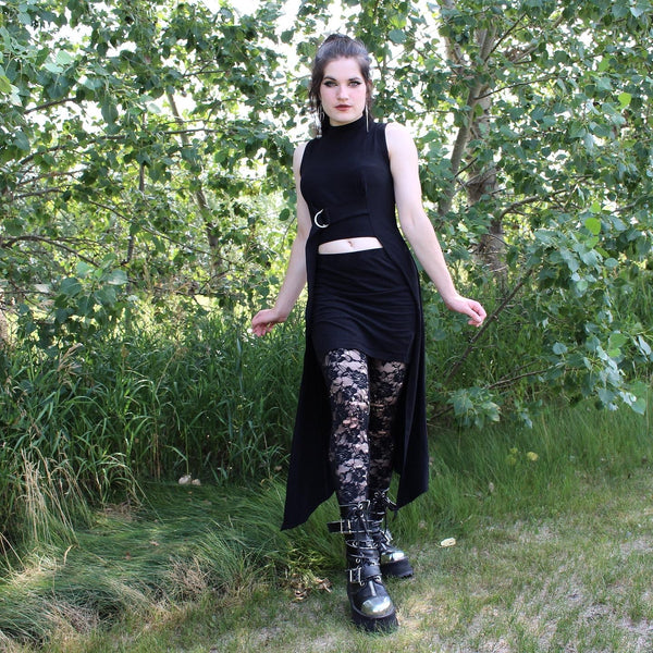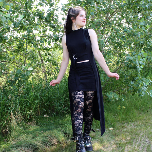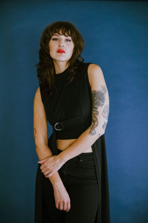 The dramatic D-ring tunic pairs equally well with pants, skirts or shorts, and cinches gently under the bust. An elegant mock neck combined with an angular hem and open front makes this an elevated statement piece.Material:66% Tencel28% Organic cotton6% Spandex