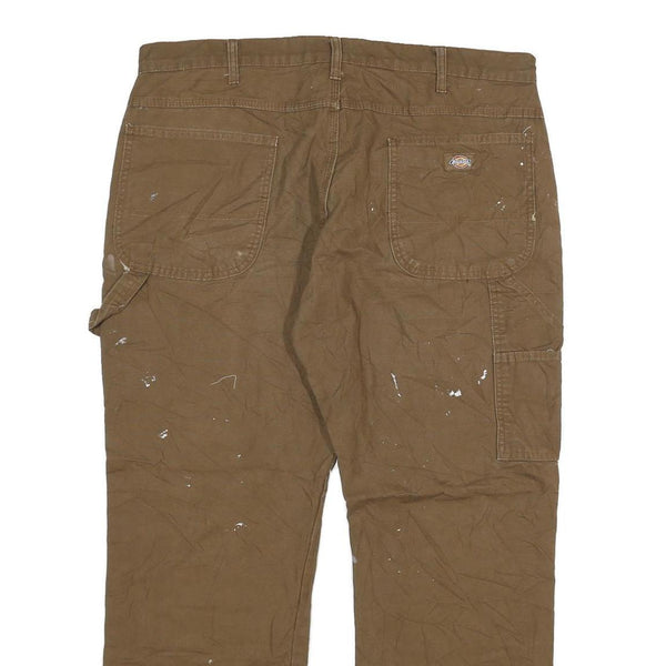 These Dickies mens trousers are crafted from a durable cotton blend fabric featuring a brown colour throughout. The design is simple yet functional, with visible utility-style details including a side hammer loop and reinforced stitching. Light paint splatters adorn areas on both the front and back, adding a worn workwear aesthetic. The trousers close with a zip fly and button at the waist for a secure fit.