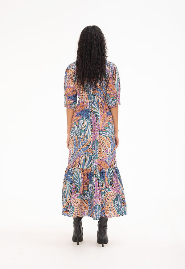 The Betty dress is the picture of elegance with three quarter sleeves, a high crew neckline, and a tiered ruffle hem. Rendered in our floral printed cotton seersucker for supreme breathability and texture, this iteration embraces watery hues and a soft, romantic floral motif. Self tie waist and side pockets.