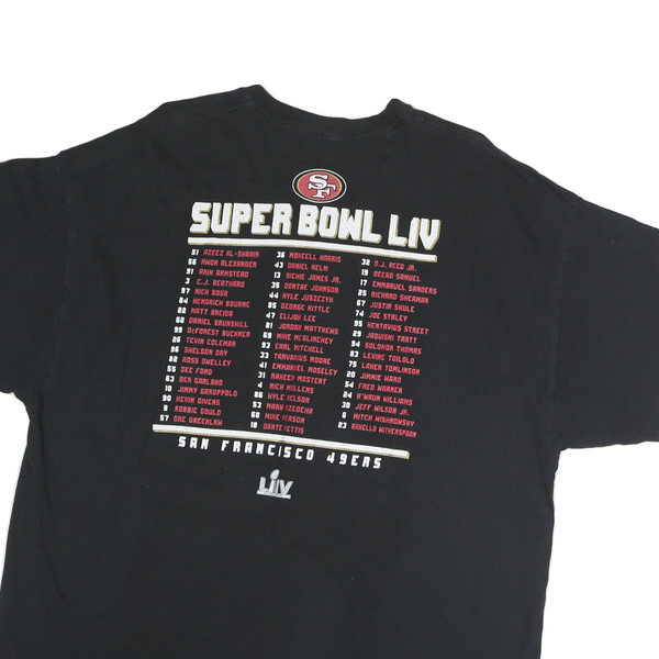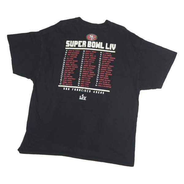 This FANATIC men's T-shirt features a black cotton construction with prominent Super Bowl LIV graphics on the front and back. The front centre displays the Super Bowl LIV logo alongside the San Francisco 49ers emblem and team name in white, gold, and red tones. The back lists the San Francisco 49ers player names in red and white text beneath the team logo and event title.