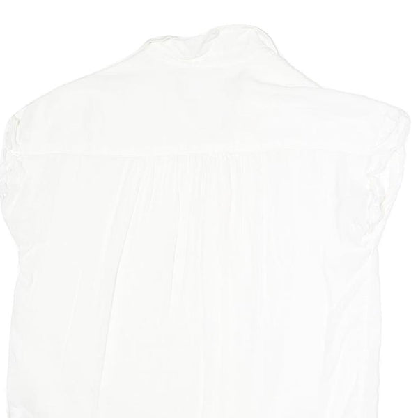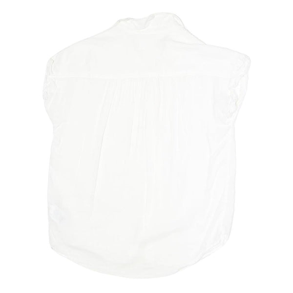 This GAP womens shirt features a crisp white colour in a soft cotton blend fabric delivering a comfortable and breathable feel. It has a classic collared neckline with a front button closure and cap sleeves that add a delicate shaping to the overall silhouette.