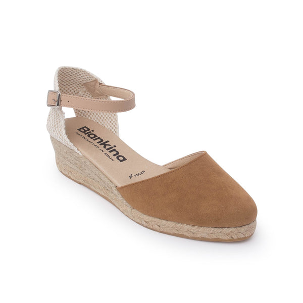 These vegan suede espadrilles with a 2" inch low wedge heel are inspired by the Mediterranean and designed for breathability, comfort, and style. Made in Spain, these are an authentic pair of exquisite, espadrilles — made by artisans who preserve centuries-old traditions of shoemaking.