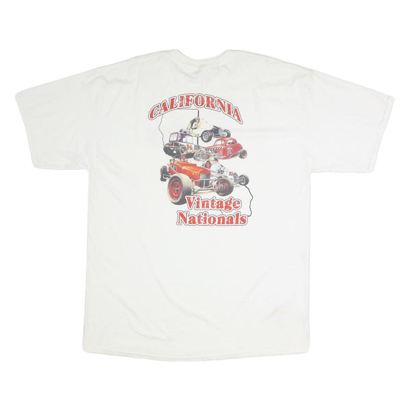 This GILDAN Mens T-Shirt is crafted from soft white cotton, offering comfort and breathability. The front chest features a colourful Shasta Raceway Park logo graphic with text, while the back showcases a large "California Vintage Nationals" print with detailed vintage race cars. The shirt has a classic crew neck and short sleeves for a relaxed fit and everyday wear.