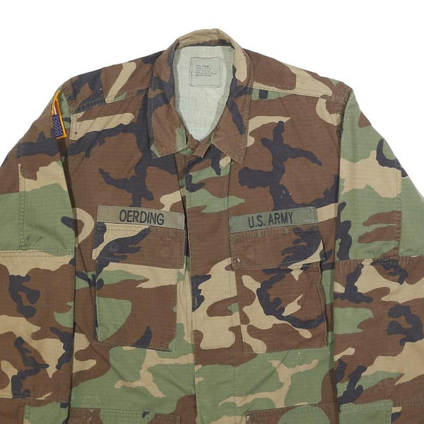 This mens jacket from Golden Manufacturing Co Inc displays a classic camouflage pattern in green, brown, and beige tones with black accents. The front features two chest pockets with flap closures, embroidered name tags reading "Oerding" and "U.S. Army", and a button closure down the front. There are additional patches on the shoulders including a US flag.