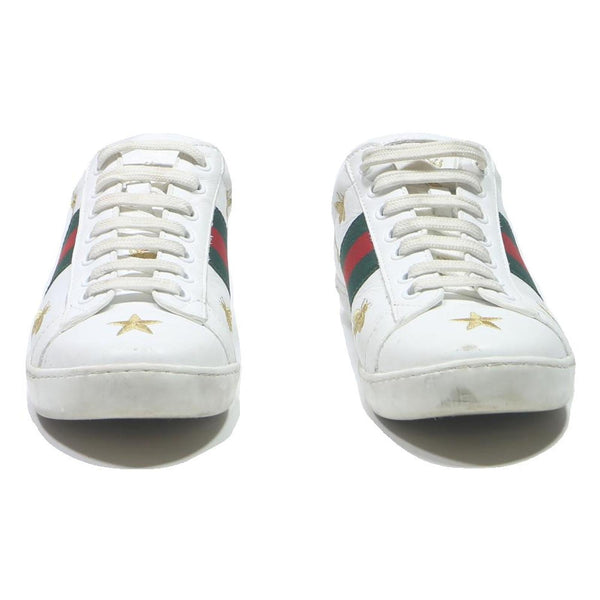These GUCCI Ace sneakers for women feature a classic white leather base adorned with iconic green and red webbing stripes on the side. Gold embroidered bee and star motifs decorate the shoe's exterior, adding a distinctive and luxurious touch that epitomizes the brand's aesthetic. The heel tab varies in colour with one shoe showing green and the other red, both in a textured pattern with 'GUCCI' branding.