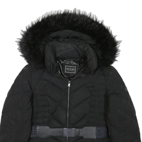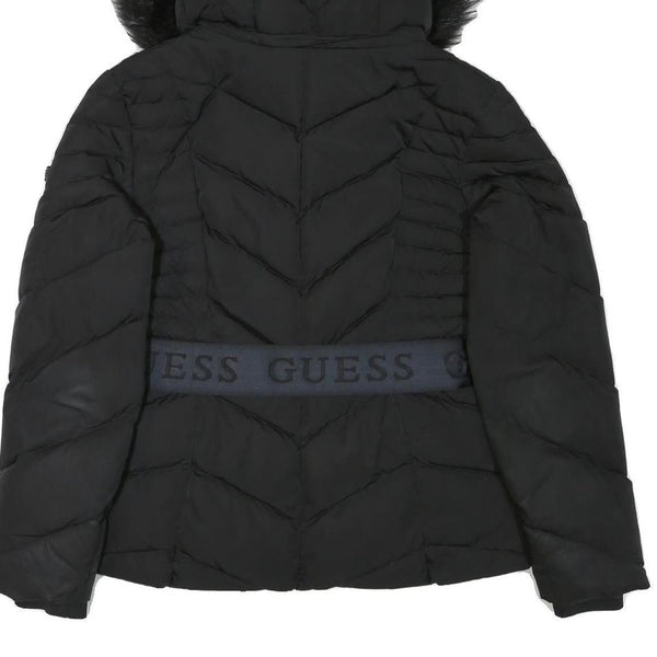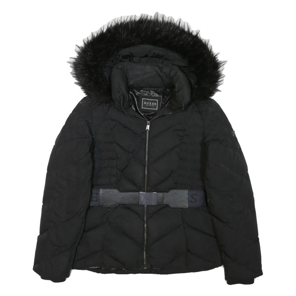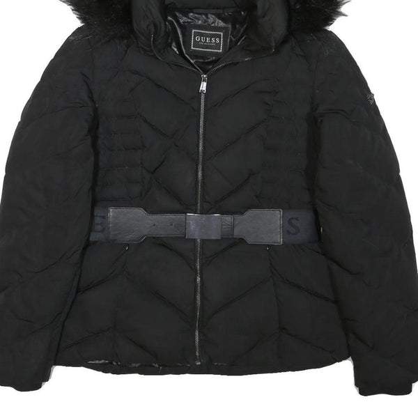 GUESS Womens Black Quilted Jacket M Polyester Blend Zip Hooded Belted Winter