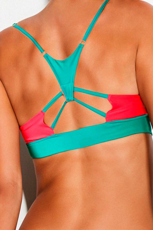 Elegant sporty bikini top with sleek open back and curved plunge neckline. It is designed to ensure a perfect fit and better shape retention, as well as correct muscle compression and excellent resistance. Suitable for surfing, swimming, hiking, or yoga.