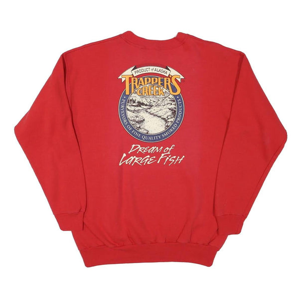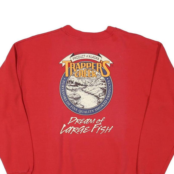 This HANES men's sweatshirt features a vibrant red colour with a distinctive "Trappers Creek" logo printed on the left chest and a large matching graphic on the back. The graphics include the text "Product of Alaska," "Purveyors of Fine Quality Smoked Products," and "Dream of Large Fish," enhancing its unique and outdoorsy character.