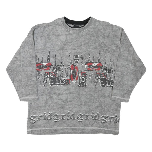 This JINGLES Mens sweatshirt features a grey cotton blend fabric with a unique graphic print across the chest and along the hem. The front displays abstract text designs in black, white, and red tones, adding artistic flair to the casual pullover. The colour is a soft grey with a subtle marbled texture giving it a distinct look.