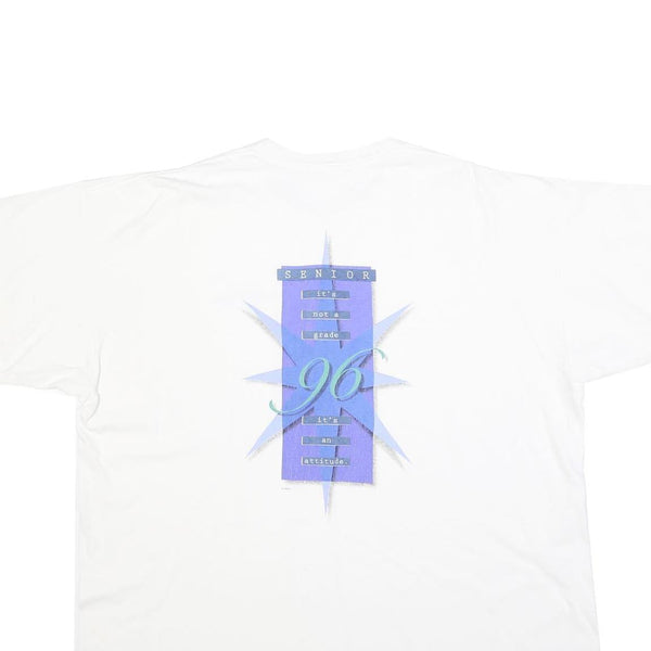 This mens white T-shirt from JOSTENS features a small front chest graphic with the words "senior 96" in teal and blue, complemented by a large back print. The back graphic displays "SENIOR" at the top with text that reads "it's not a grade, it's an attitude" surrounding a large teal number 96 over a starburst design.