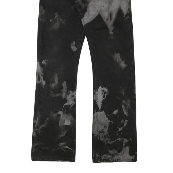 These Levi's 517 mens jeans feature a distinctive black base with a unique stone wash effect creating a bold, abstract pattern of light grey splotches across the legs. The branding is authentic with the classic Levi's red tab visible on the side pocket and the signature brown leather patch on the back waistband.