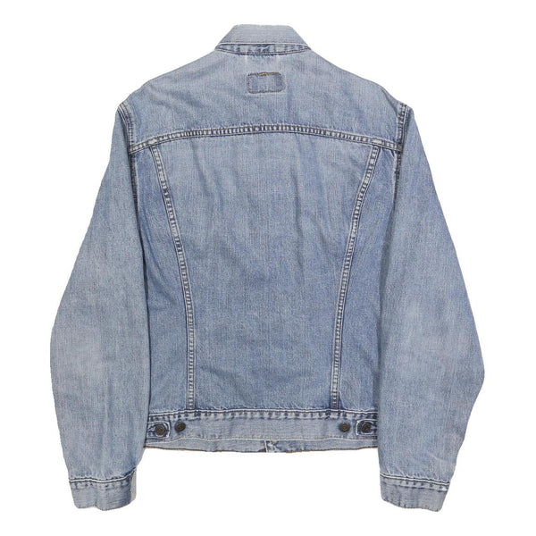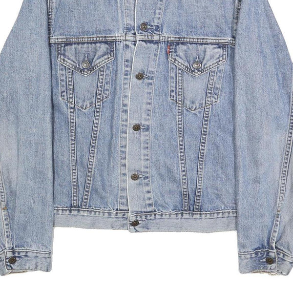This is a classic Levi's mens denim jacket in a light blue wash. It features traditional button fastening down the front with two chest flap pockets and a pointed collar. The denim fabric is 100% cotton, offering sturdy yet comfortable wear with a timeless look.