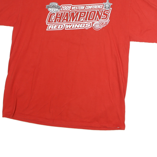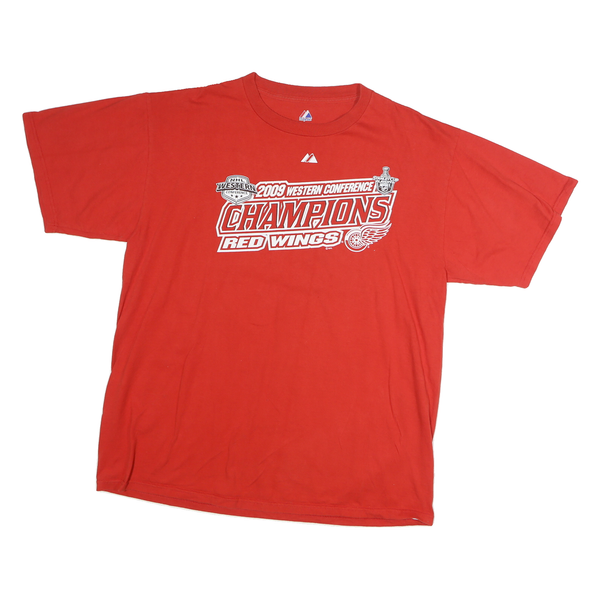 This Majestic mens T-shirt is a vibrant red colour featuring a central graphic print celebrating the 2009 Western Conference Champions Red Wings. The front prominently displays bold white text and logos related to the NHL Western Conference and the Stanley Cup playoffs, complemented by the iconic Red Wings emblem. The back of the T-shirt is plain red with no additional prints or patterns.