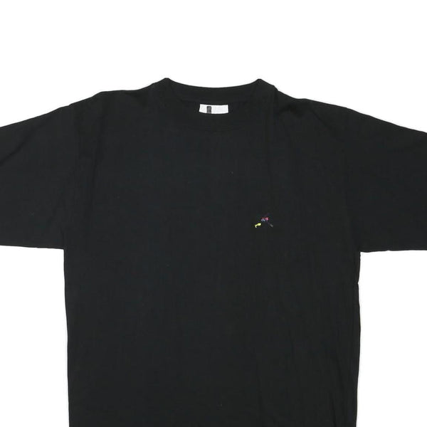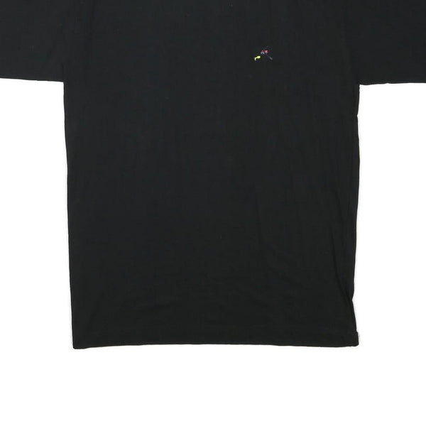 This mens black t-shirt features a small multicoloured embroidered detail on the chest left side. The design is subtle, with no other visible graphics or branding on the front or back, presenting a clean and minimalist look. The t-shirt has a classic crew neck and short sleeves, typical of a comfortable everyday fit.