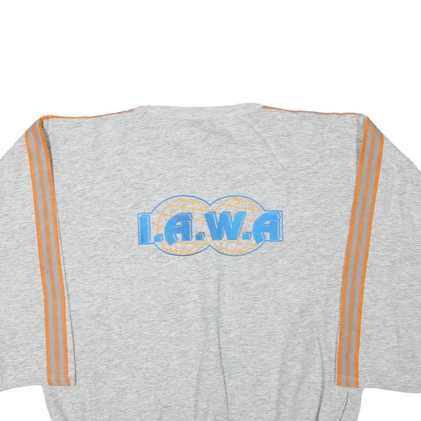 This men's sweatshirt in grey features a V-neck design and is made from a comfortable cotton blend fabric. It has orange striped detailing running down the length of the sleeves for a sporty touch. The front chest area displays a small "I.A.W.A" logo in blue and yellow, mirrored in a larger design across the upper back.