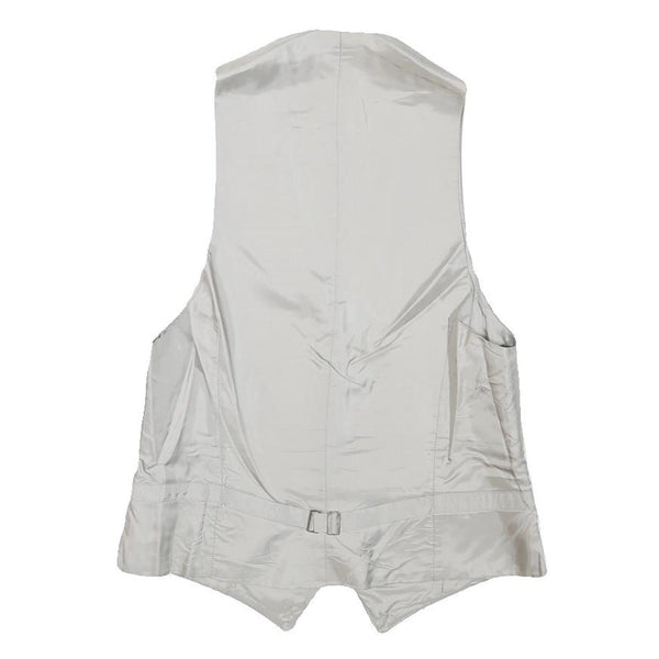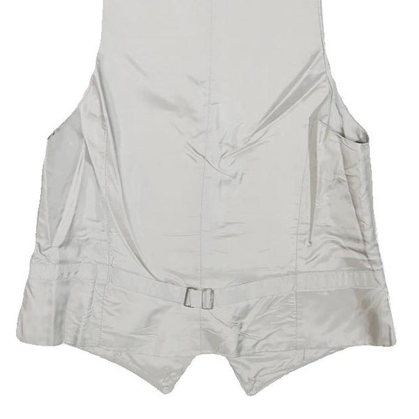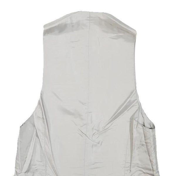 The back panel is made of a cream-coloured satin-like fabric with an adjustable strap to ensure a perfect fit. The jacket's sleeveless design and slim fit offer comfortable layering options for formal or smart-casual occasions. Its timeless style is ideal for dressy events or professional settings, providing an elegant finish to any outfit.