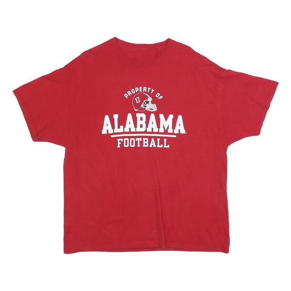 This vibrant red men's T-shirt prominently displays bold white printed text and graphics reading "Property of Alabama Football" on the front along with a helmet graphic. The reverse features a large "Alabama" text above a football graphic with a stylised "A" logo centre. Made from a soft cotton blend fabric, it offers comfortable wear with a traditional classic fit and a crew neckline. The short sleeves and simple hem complete this casual and sporty look.