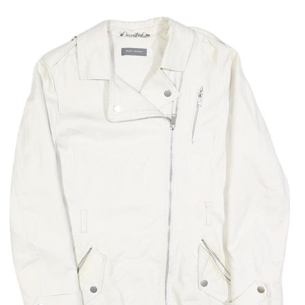 This Womens white jacket from Mint Velvet features a cotton blend fabric with a smooth texture and a soft handfeel. It has a long sleeve design and a button closure, complemented by silver-tone hardware on the zippers and cuff straps, giving it a polished yet relaxed look.