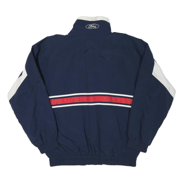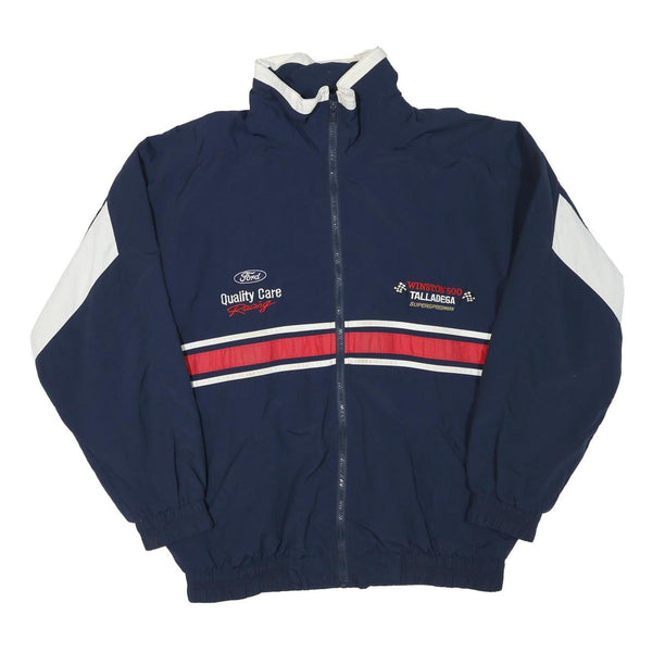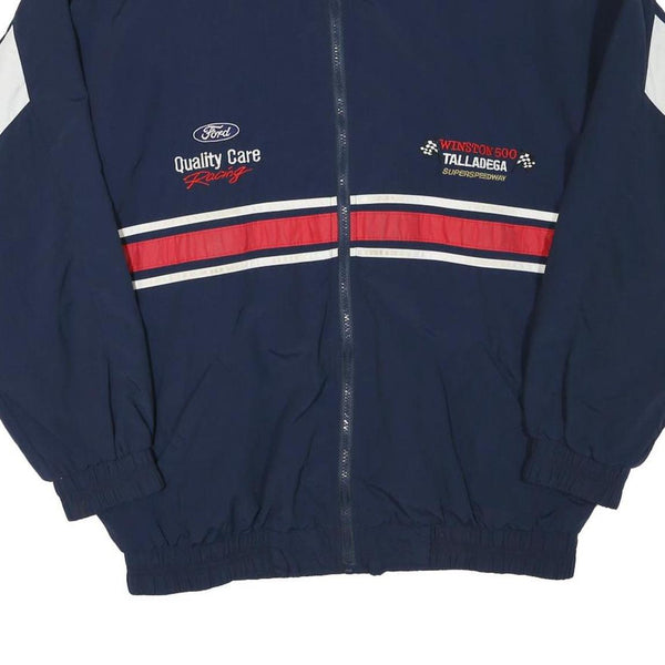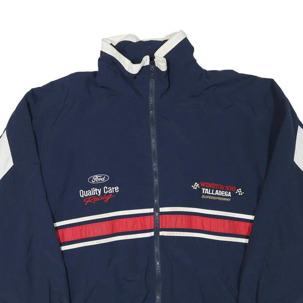 This mens jacket from MPM features a deep blue base complemented with white panels on the sleeves and contrasting red and white racing stripes across the chest and back. It has embroidered racing graphics including 'Ford Quality Care Racing' on the left chest and 'Winston 500 Talladega Superspeedway' on the right chest, with a smaller Ford logo embroidered on the back collar. The design gives a strong motorsport aesthetic.