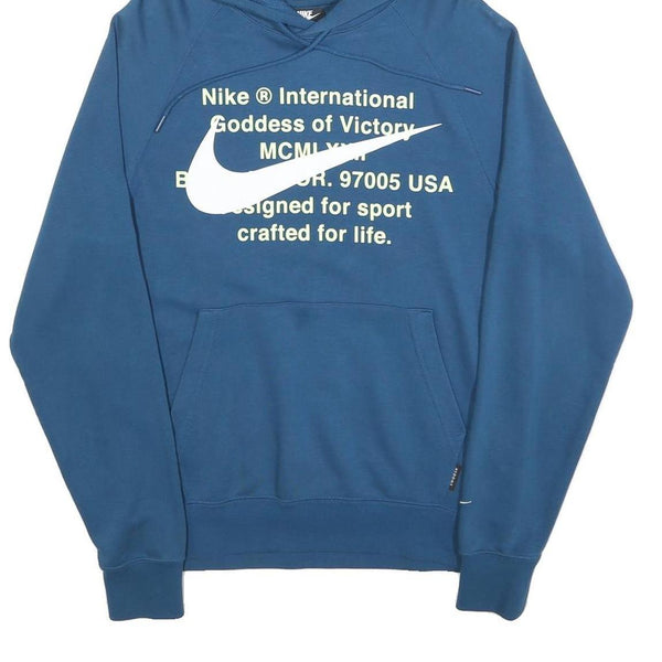 This mens blue hoodie from Nike features a bold white text and swoosh graphic on the front, displaying Nike branding and slogans. The back shows a small white Nike swoosh near the neckline and a small swoosh detail on the wrist, adding subtle branded accents. The hoodie has a classic pullover style with a kangaroo pocket and adjustable drawstring hood.