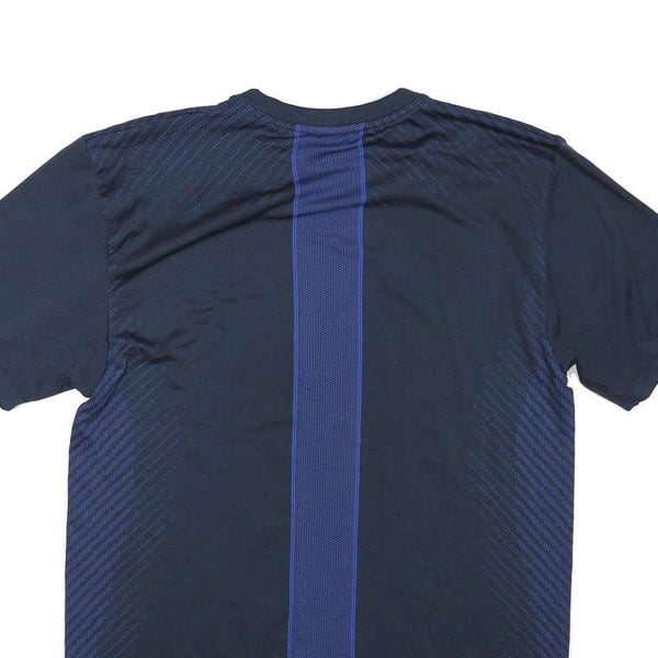 The fit is tailored for a comfortable, sporty look with a classic crew neckline and short sleeves. The back features a vertical navy panel with fine mesh textures enhancing ventilation. This versatile T-shirt suits exercise or everyday casual styling.