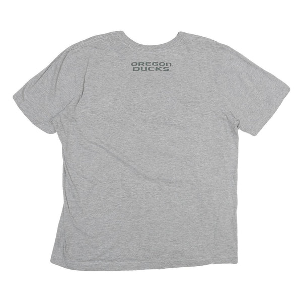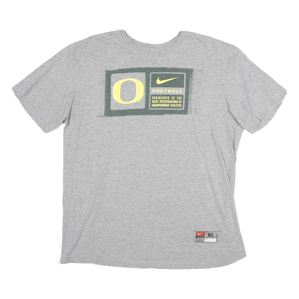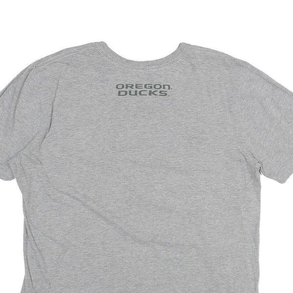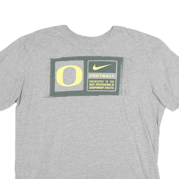 This Nike Mens T-shirt is crafted from soft grey cotton, offering a comfortable and breathable fit ideal for casual wear or sports. The front features a distinctive graphic with a large letter 'O', the Nike swoosh, and text highlighting its engineering for championship athletes, presenting a sporty and authentic design. The back is subtly branded with 'Oregon Ducks' printed near the neckline, adding collegiate sports appeal.