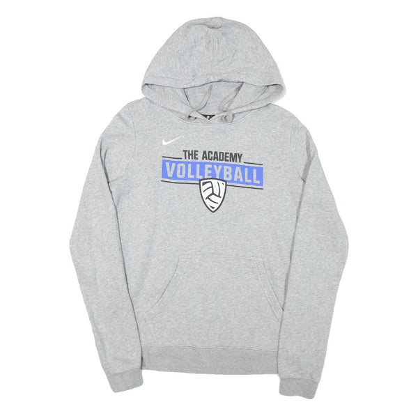 This Nike Womens hoodie features a heather grey colour with a prominent front print that reads "THE ACADEMY VOLLEYBALL" in black and blue fonts, complemented by a volleyball emblem below. The iconic white Nike Swoosh is printed on the chest, underscoring the brand's athletic identity.