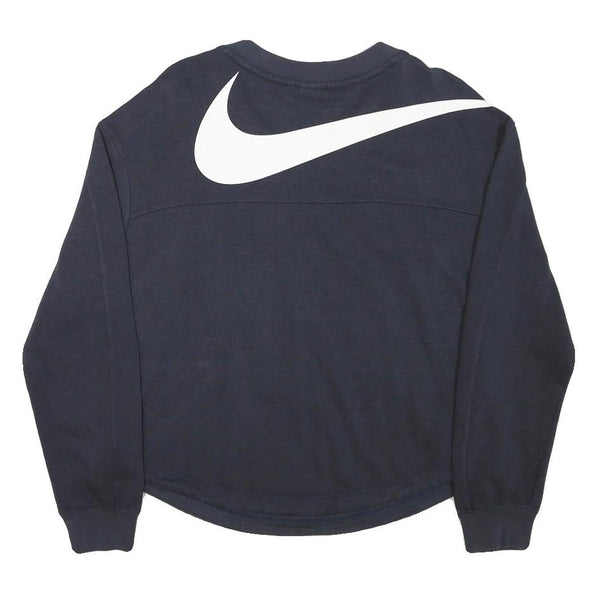 This womens sweatshirt by Nike is presented in a deep navy blue colour, featuring a bold white Nike logo on the front chest and a large white swoosh graphic extending across the back shoulders. The design is simple yet impactful, making it a versatile athletic and casual wardrobe staple.