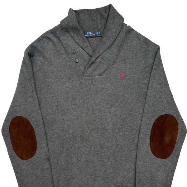 Grey Long Sleeve T-Shirt With Shawl Collar And Elbow Patches.
