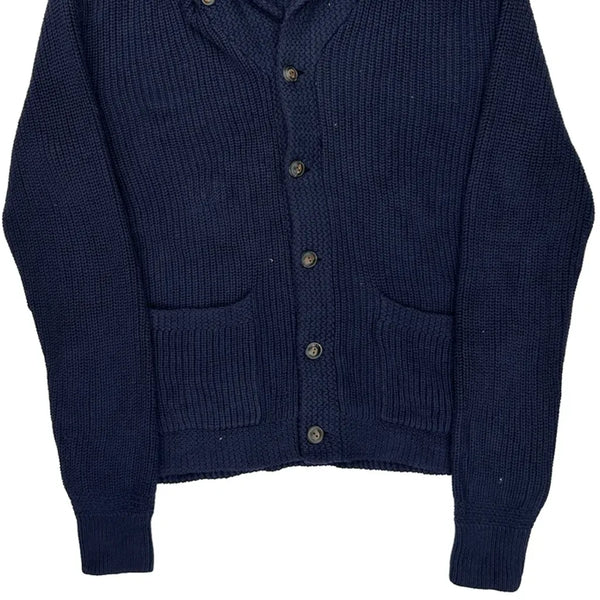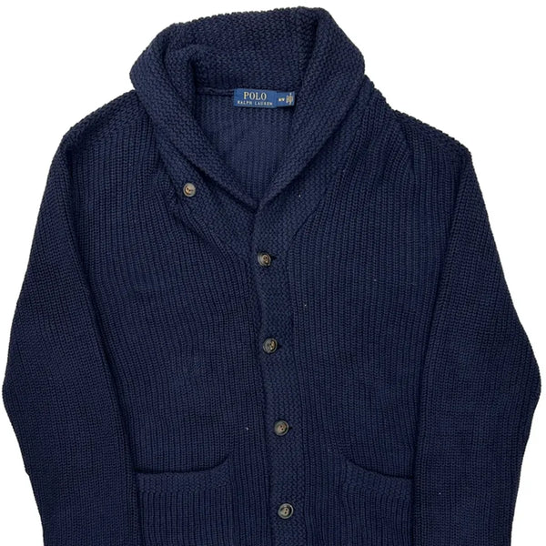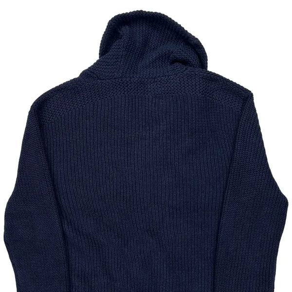 Navy Blue Knit Top With Shawl Collar And Buttons