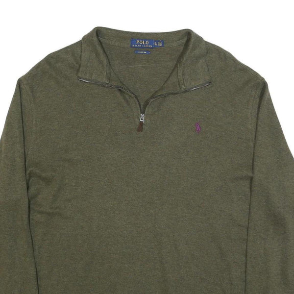 This Polo Ralph Lauren mens jumper features a muted green colour with a subtle purple embroidered pony logo on the left chest, offering understated brand recognition. It has a quarter zip neck for added style and slight warmth, finished with a neat V-neckline that suits layering.