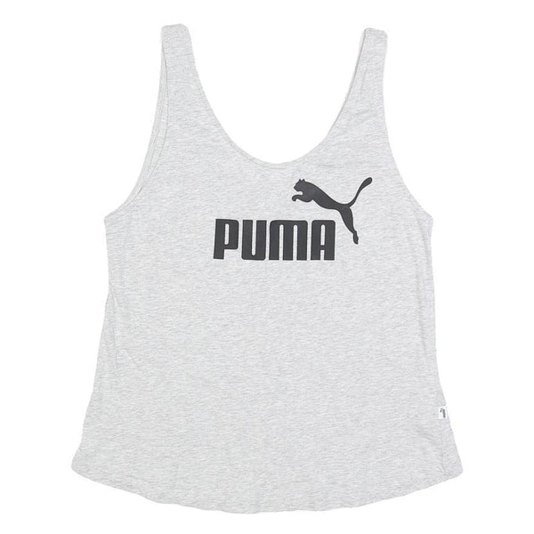 This womens PUMA top features a light grey shade throughout with a bold black PUMA logo printed centrally on the chest, showcasing the iconic leaping puma graphic. The sleeveless design and scoop neckline offer a casual and relaxed fit ideal for warm weather or layering.