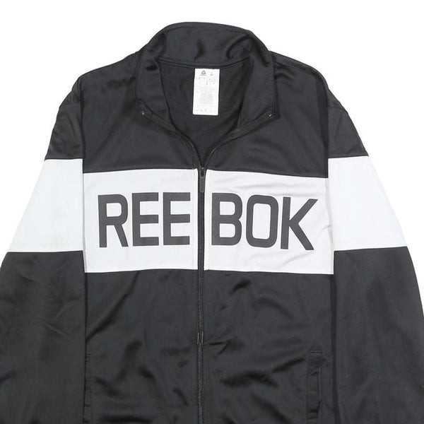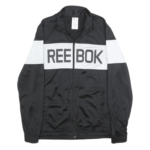 This men's Reebok track jacket features a bold black and white colourblock design with a striking large REEBOK logo printed across the chest. The jacket is constructed from smooth polyester fabric, giving it a lightweight yet durable feel ideal for sports or casual wear.