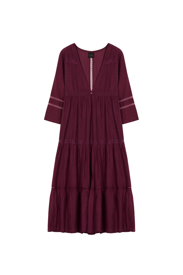 The Ally dress has a mid-calf length cut and three-quarter sleeves. Its ruffles are delimited by delicate and transparent lace edging. It is made from organic soy fiber, or “vegetable cashmere”.