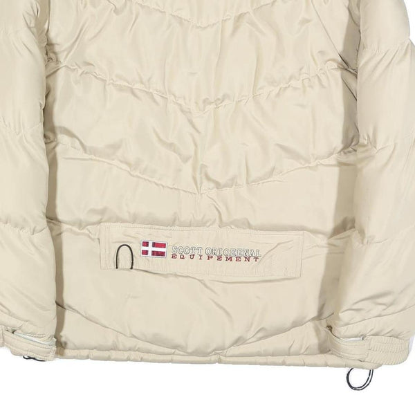 This SCOTT mens jacket features a clean beige colour with subtle branding on the chest and collar, showcasing the Scott Origenal name. The back has additional branded detailing including a patch with a Norwegian flag motif and Scott Origenal Equipement text. The jacket is quilted in a puffer style which provides a warm and comfortable fit. It has long sleeves with adjustable cuff straps and a high collar for added protection against the cold.