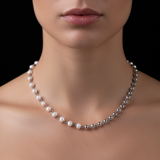 The unisex necklace is crafted from linked white freshwater pearls and polished stainless steel. It can be worn alone for a sophisticated touch of elegance, or layered with a charm necklace for a look that's uniquely yours
