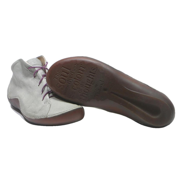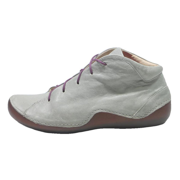 These THINK womens ankle boots feature a soft light grey leather upper with a smooth texture and durable stitching accents. The boots have a simple yet distinctive design that includes purple lace-up fastening for a subtle pop of colour. The uppers extend just above the ankle for modest coverage.
