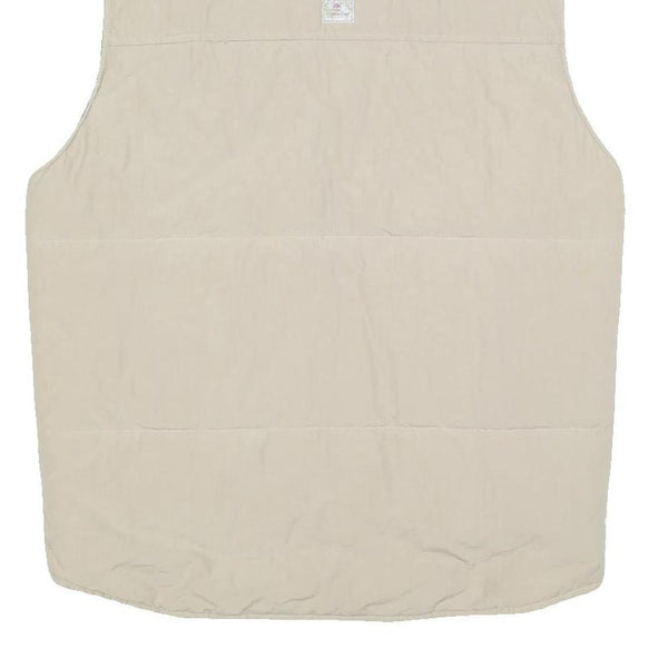 The sleeveless design allows for freedom of movement, making it perfect as a layering piece. The interior lining is a smooth olive-green fabric, complementing the neutral tones of the jacket. Timberland is well known for its reliable and rugged outdoor clothing, designed to keep wearers comfortable in cooler weather.