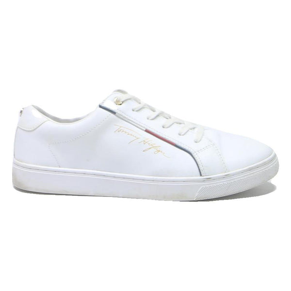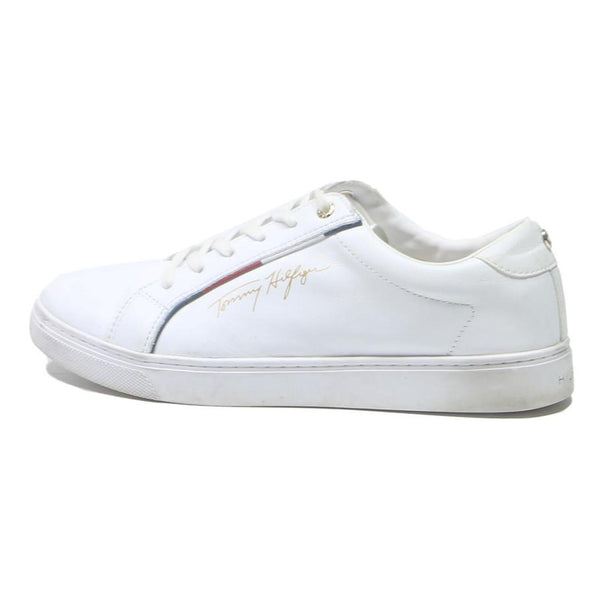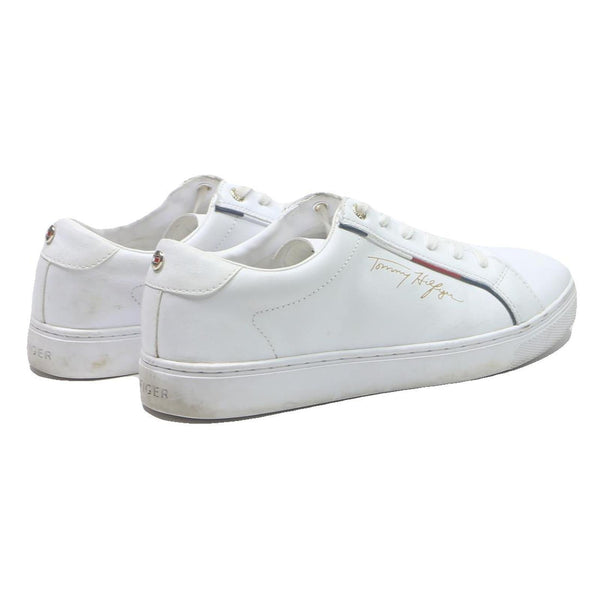 These Tommy Hilfiger womens trainers feature a sleek low top design crafted from smooth white leather. The side of the shoe displays the elegant Tommy Hilfiger signature branding in gold script alongside subtle accents of the brand's signature red, white, and blue. The trainers have white laces and a white rubber sole designed for everyday comfort and style.
