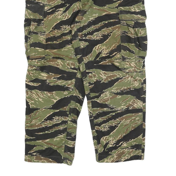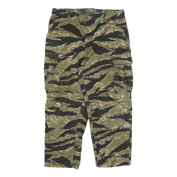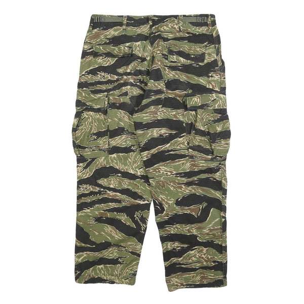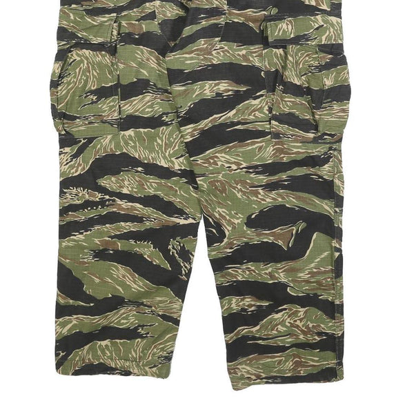 These TRU-SPEC trousers feature a distinctive green and brown camouflage pattern with black accents, ideal for outdoor or tactical use. The camouflage design is bold and evenly distributed across the fabric, providing a classic military-inspired look.