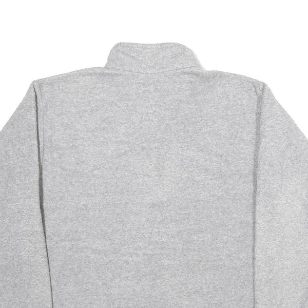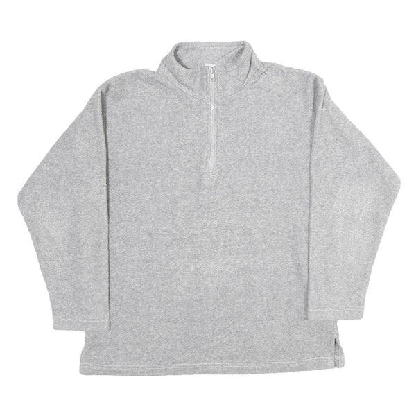 This jumper features a clean grey colour with a soft, heathered appearance. It has a simple, classic silhouette with a crew neckline and a quarter zip closure at the front, combining both style and practicality.