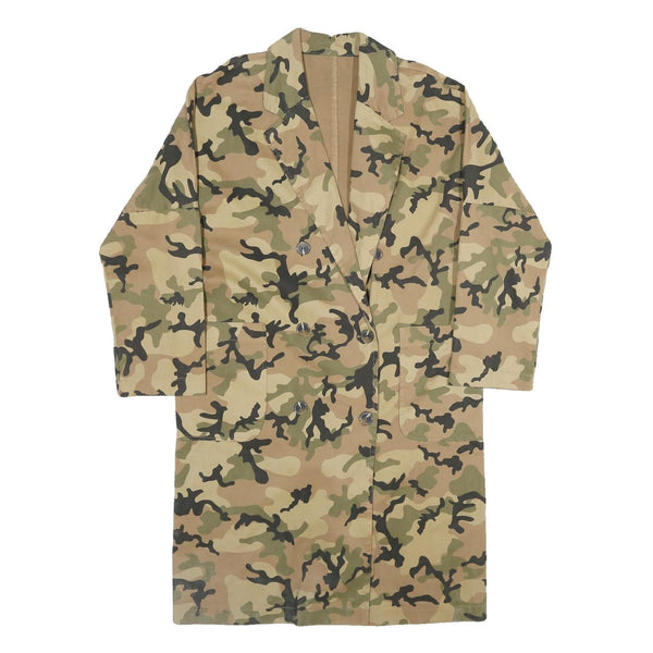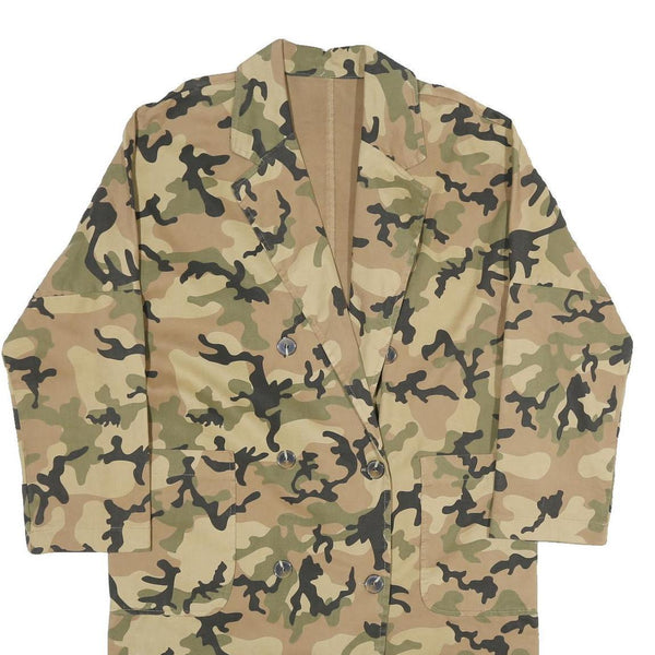 This womens jacket features a beige and green camouflage print covering the entire garment, creating a bold and stylish military-inspired look. The front has a double-breasted button closure with matching buttons, and two front patch pockets add practicality and design interest. The jacket has a classic lapel collar and long sleeves, contributing to its versatile style.
