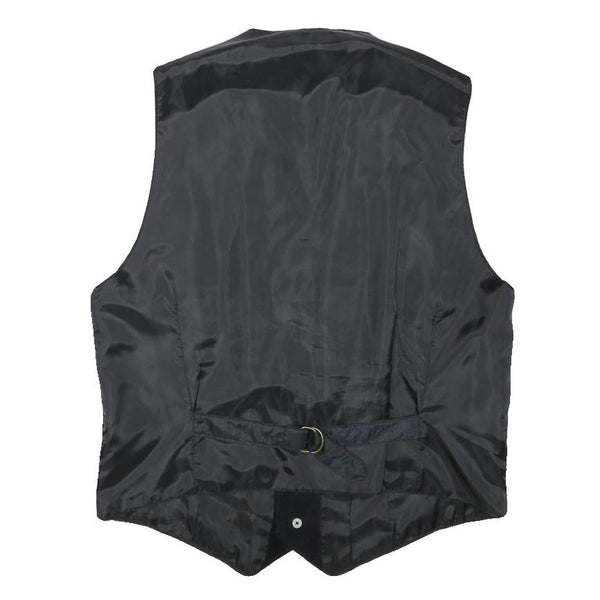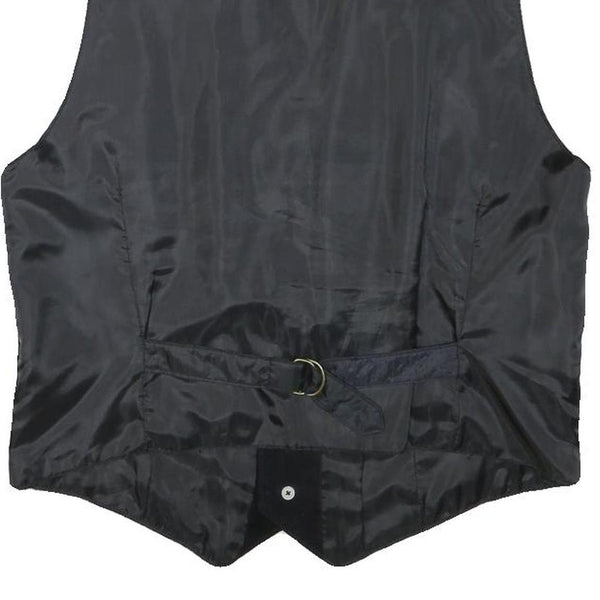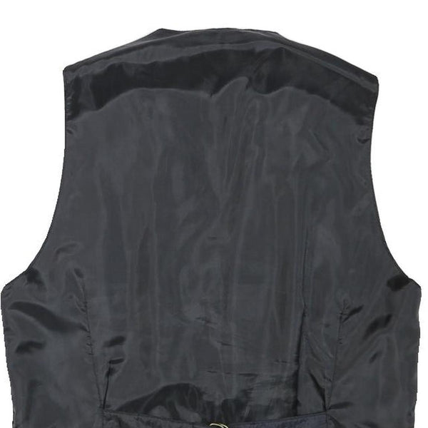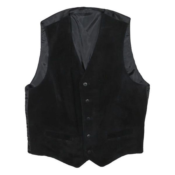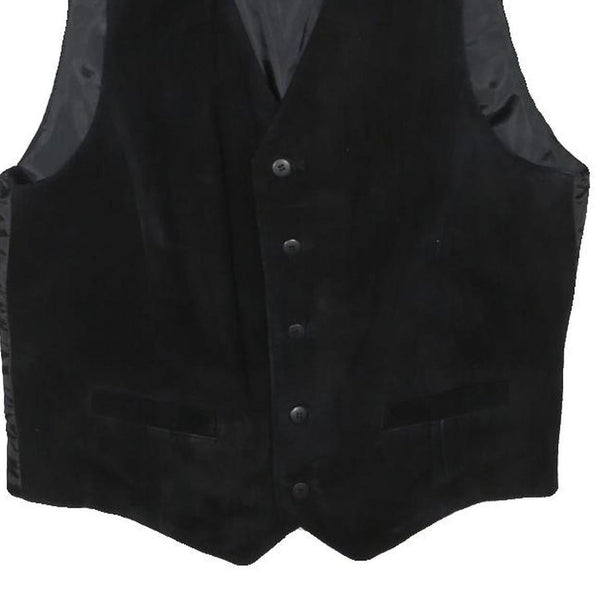 This womens jacket features a sleek black colour with a classic button closure at the front. The fabric has a smooth texture typical of a polyester blend, providing a subtle sheen and lightweight feel. It is designed without sleeves, offering versatility for layering over various outfits.