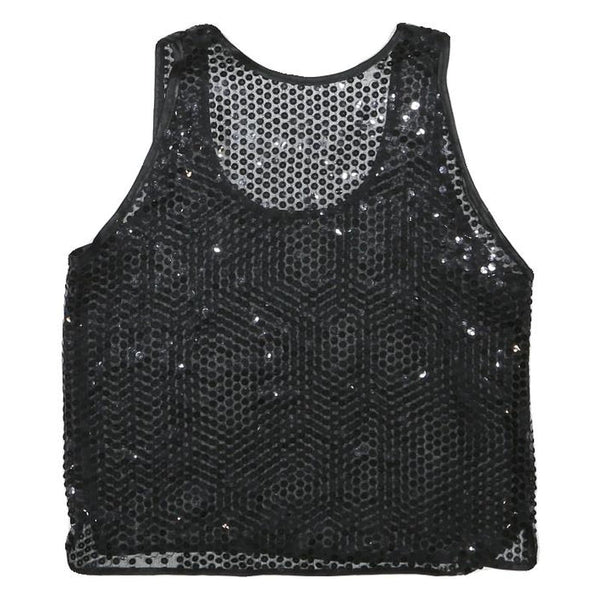This women's vest top is crafted from a polyester blend fabric featuring a black mesh base fully adorned with shiny sequins arranged in a geometric hexagonal pattern. The sleeveless design and round neckline create a flattering, airy fit perfect for layering or standalone wear.