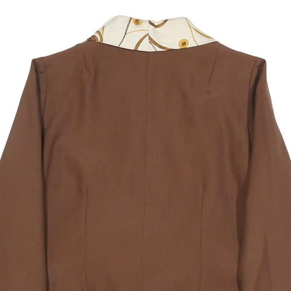 The pattern on the collar adds a unique and eye-catching element, contrasting beautifully against the solid brown of the main body. This versatile jacket combines timeless tailoring with a playful design feature, perfect for adding sophistication to any wardrobe.