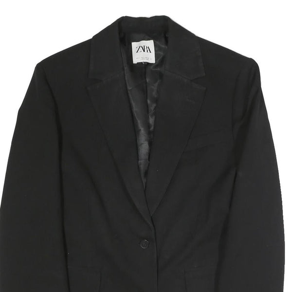 This ZARA womens jacket is classic black with a tailored fit and a smooth polyester blend fabric. It features a clean, plain finish with a smart button closure at the front, offering a polished and versatile style suitable for many occasions.