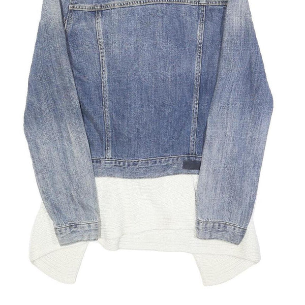 This womens jacket from Abercrombie & Fitch features a classic blue denim body paired with an extended white cotton knit hem and shawl collar for a unique layered look. The front buttons up with metal fastenings and includes two flap patch pockets. The denim has a softly faded wash with slight distressing for casual appeal.