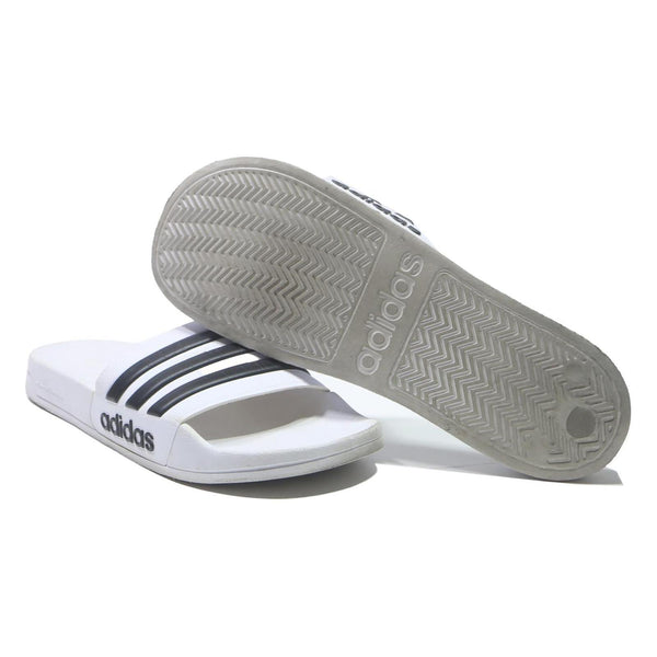 These Adidas Adilette slide sandals feature a classic white base with black iconic three stripes and Adidas branding on the side. Made from durable synthetic material, they offer a lightweight and water-friendly design perfect for casual wear.